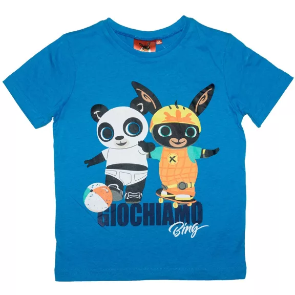 Bing nyuszis rövidujjú póló kisfiúknak kék színben, Binggel és Pandóval díszítve.