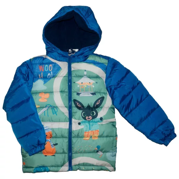 Bing nyuszis télikabát kisfiúknak polár béléssel kék színben.A kabátot Bing és Flop díszíti, háta egyszínű kék.Kapucnis, 2 zsebbel oldalán, a zippzár húzókáján nyuszifej minta.