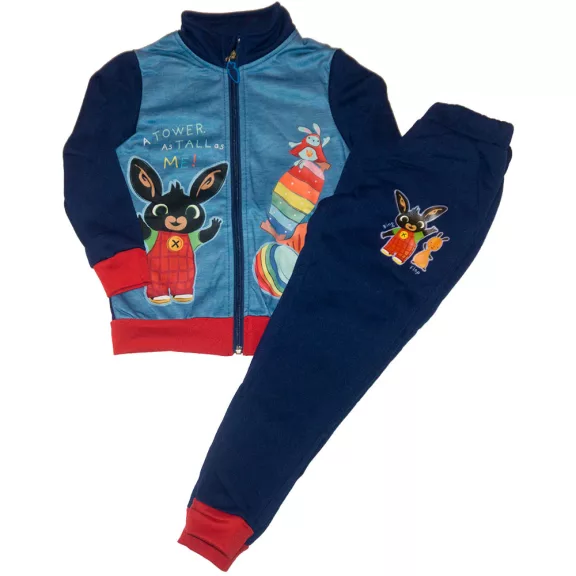 Bing nyuszis belül bolyhos anyagú szabadidőruha kisfiúknak sötétkék színben, Binggel, Floppal és Hoppityvel díszítve.