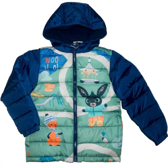 Bing nyuszis télikabát kisfiúknak polár béléssel sötétkék színben.A kabátot Bing és Flop díszíti, háta egyszínű sötétkék.Kapucnis, 2 zsebbel oldalán, a zippzár húzókáján nyuszifej minta.