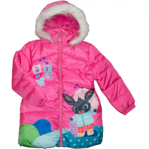 Bing nyuszis télikabát kislányoknak polár béléssel rózsaszín színben.A kabátot az elején Bing díszíti, hátaán Szula és Koko nyuszi látható.Kapucnis, 2 zsebbel oldalán, a zippzár húzókáján virág minta.
