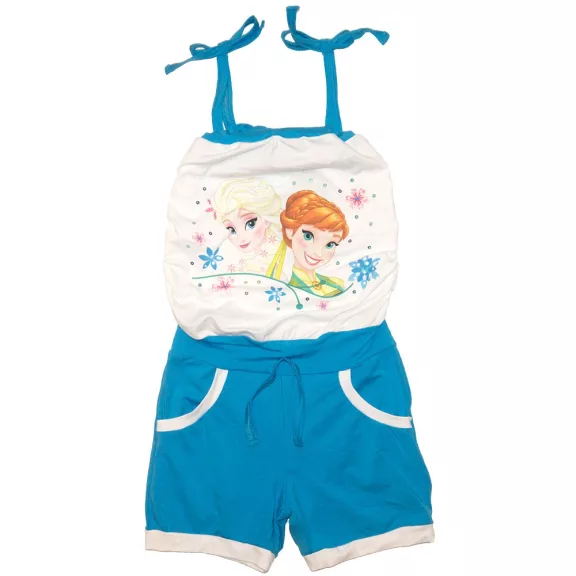 Jégvarázsos kislány nyári overál fehér és kék színben.Ez a gyönyörű Anna és Elsa hercegnő mintás ruha kényelmes nyári viselet.