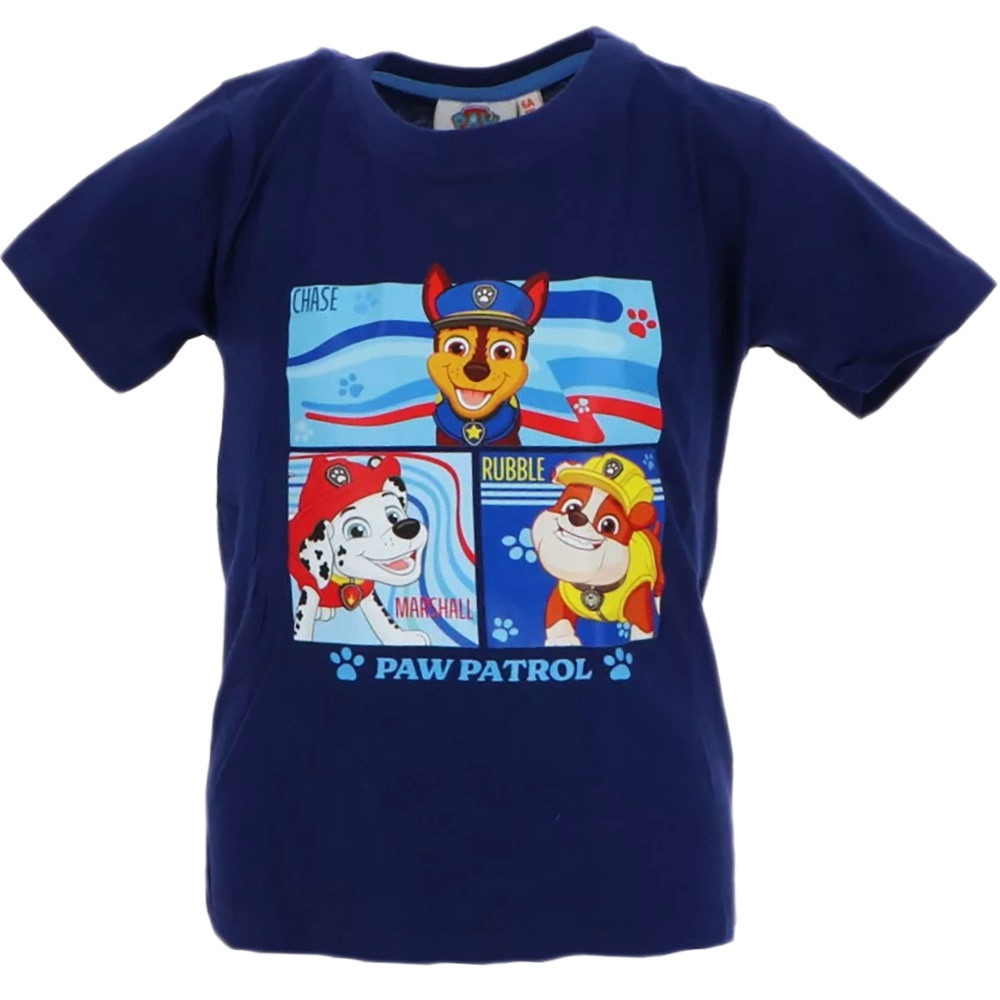 Sötétkék színű Mancs Őrjárat póló, amelyet a népszerű mentőkutyák, Chase, Rubble és Marshall vidám mintája díszít. Ideális választás minden Paw Patrol rajongó kisfiú számára.