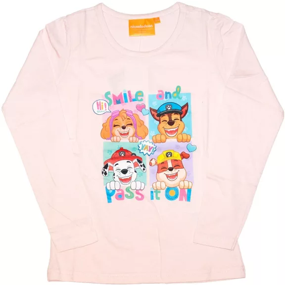 Mancs Őrjáratos hosszú ujjú póló kislányoknak Skye, Rubble, Chase és Marshall kutyával díszítve.Anyaga: 100 % pamut.