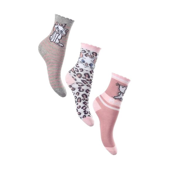 Aranyos Marie cica mintás zokni szett kislányoknak, a Disney Aristocats mese kedvelőinek. A csomag 3 pár zoknit tartalmaz, amelyek puhák, kényelmesek és rugalmasak, ideálisak mindennapi viselethez.