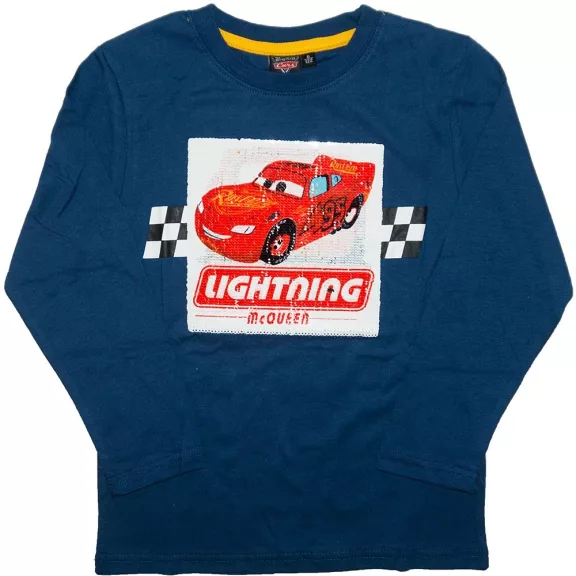 Verdás simogatós hosszúujjas póló sötétkék színben. Nagy flitteres átsimogatható Villám McQueen minta díszíti a pólót.Anyaga 100% pamut.